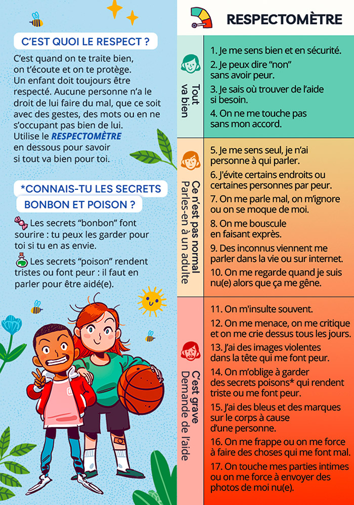 Pensé comme un outil de prévention et de sensibilisation accessible à tous, le Respectomètre est disponible sur cette page, afin que chacun puisse le télécharger gratuitement. Il s’adresse aux enfants, mais aussi aux parents, pour faciliter le dialogue au sein de la famille, et aux professionnels de l’enfance (enseignants, éducateurs, personnels de crèche, travailleurs sociaux, psychologues, animateurs…), comme support pédagogique et outil d’échange.
